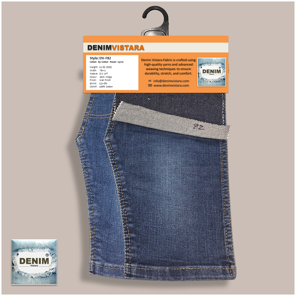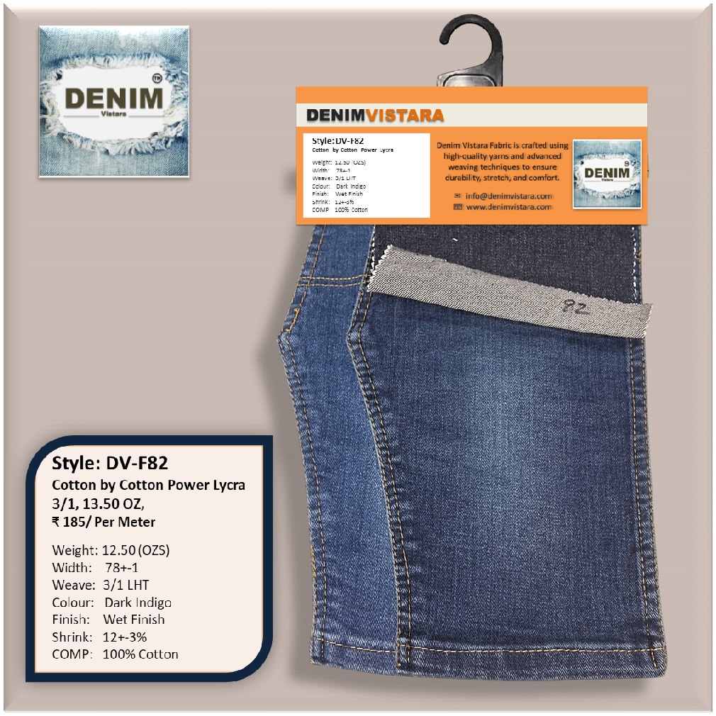 Denim Vistara presents Cotton by Cotton Power Lycra denim fabric – a premium-quality textile crafted for superior comfort, flexibility, and durability. With a substantial weight of 12.50 oz and a width of 78±1 inches, this fabric features a 3/1 Left Hand Twill (LHT) weave that ensures a soft hand feel and excellent drape.