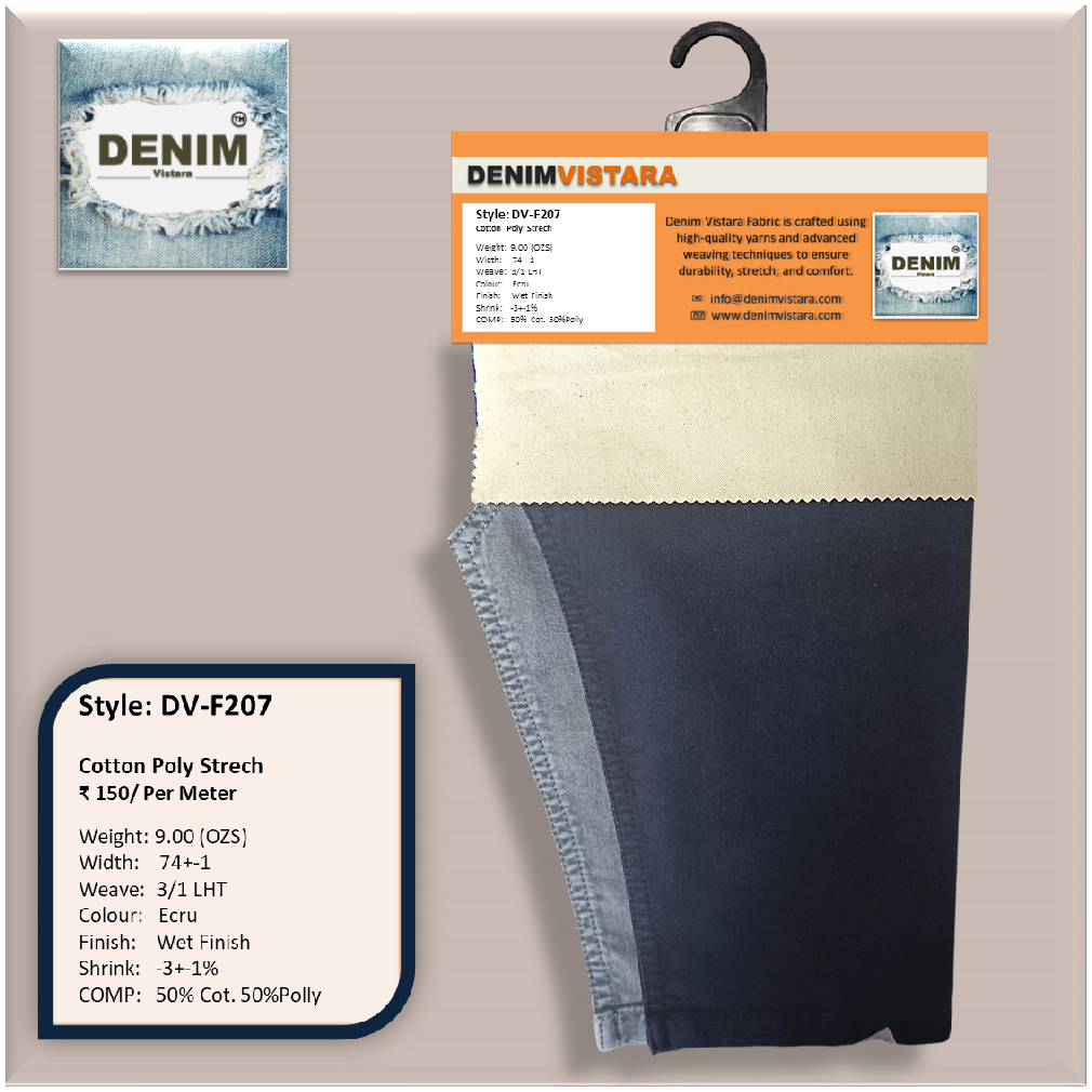 Denim Vistara offers lightweight 9 oz denim fabric crafted with a 3/1 left-hand twill (LHT) weave, providing a soft hand feel and natural drape. This fabric comes in an ecru (undyed) shade with a wet finish, making it ideal for dyeing, casual wear, and fashion-forward garments.