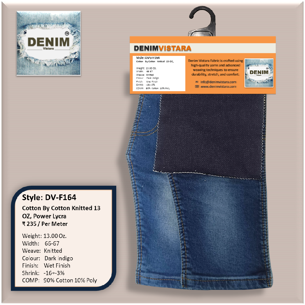 Denim Vistara presents premium Knit Dobby Denim Fabric in a deep Dark Indigo shade, designed for high-performance and style. With a weight of 13.00 oz and width of 66” ±1, this fabric is made from a 90% cotton and 10% polyester blend, offering excellent durability and comfort. The unique knit dobby weave adds a textured look, while the wet finish enhances fabric richness. With shrinkage of -16% ±2%, it’s ideal for crafting modern, long-lasting denim garments, including jeans, jackets, and workwear.