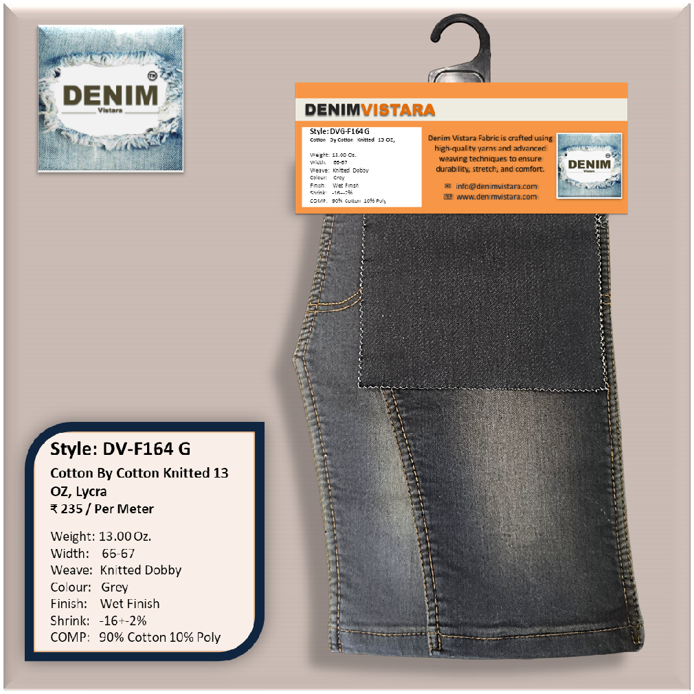 Denim Vistara introduces a high-quality Denim Knit Dobby Fabric in a versatile Grey shade, engineered for comfort and strength. With a weight of 13.00 oz and a width of 66” ±1, this fabric is woven using a knit dobby weave that adds texture and depth. Made from a 90% cotton and 10% polyester blend, it offers excellent breathability, durability, and stretch recovery. Finished with a wet process and featuring shrinkage of -16% ±2%, this fabric is ideal for premium jeans, jackets, and casual wear with a modern aesthetic.
