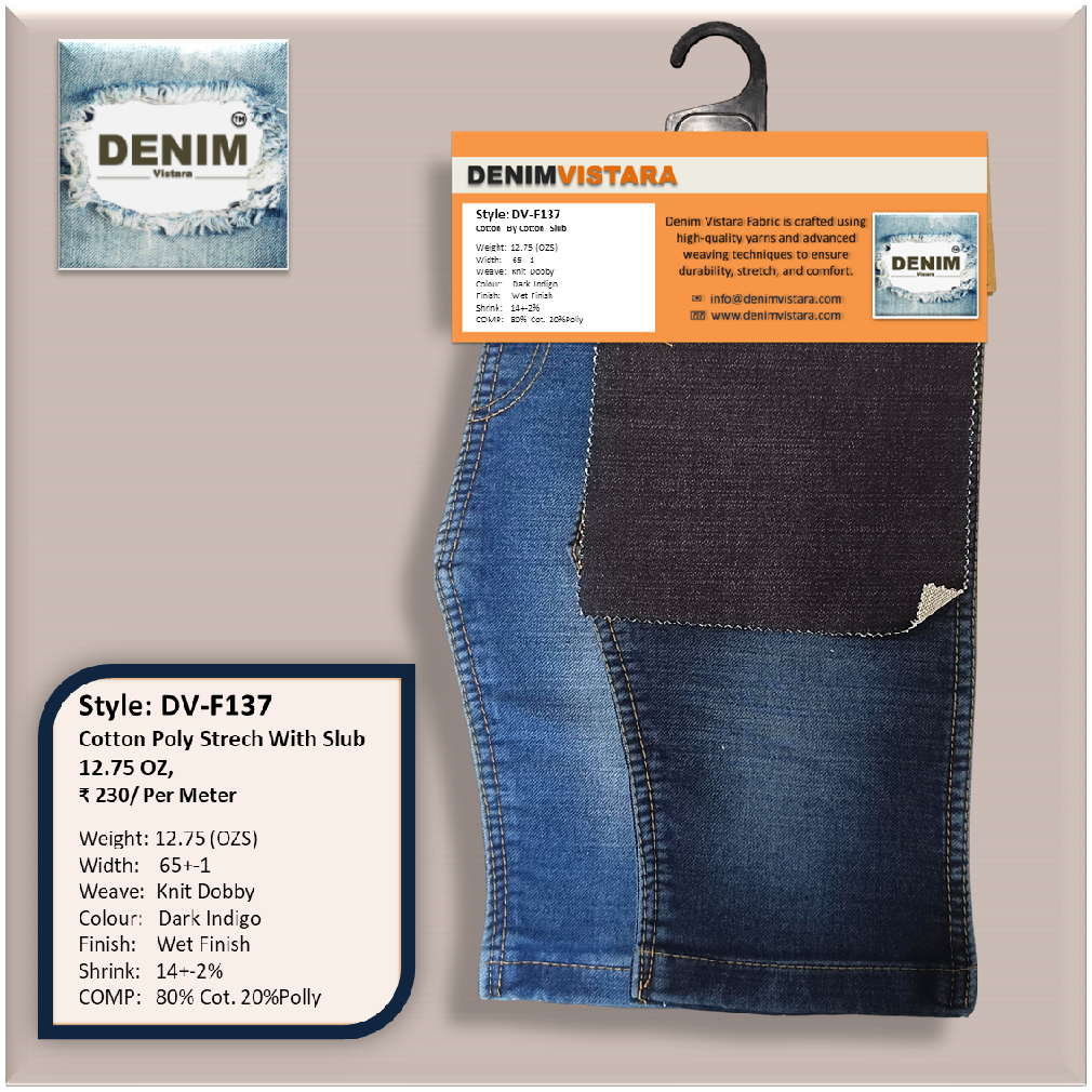 Denim Vistara introduces its premium Knit Dobby Denim Fabric, weighing 12.75 oz, designed for both comfort and style. Crafted with an 80% cotton and 20% polyester blend, this fabric combines softness, strength, and durability—ideal for modern denim applications.