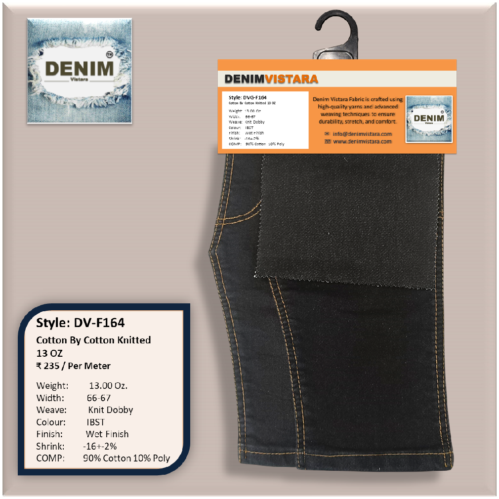 Denim Vistara presents its premium 13 OZ Knit Dobby Denim Fabric in the unique IBST shade, combining strength, comfort, and a distinct textured look. Made from a 90% cotton and 10% polyester blend, this fabric offers a soft yet durable finish, ideal for fashion-forward denim applications.