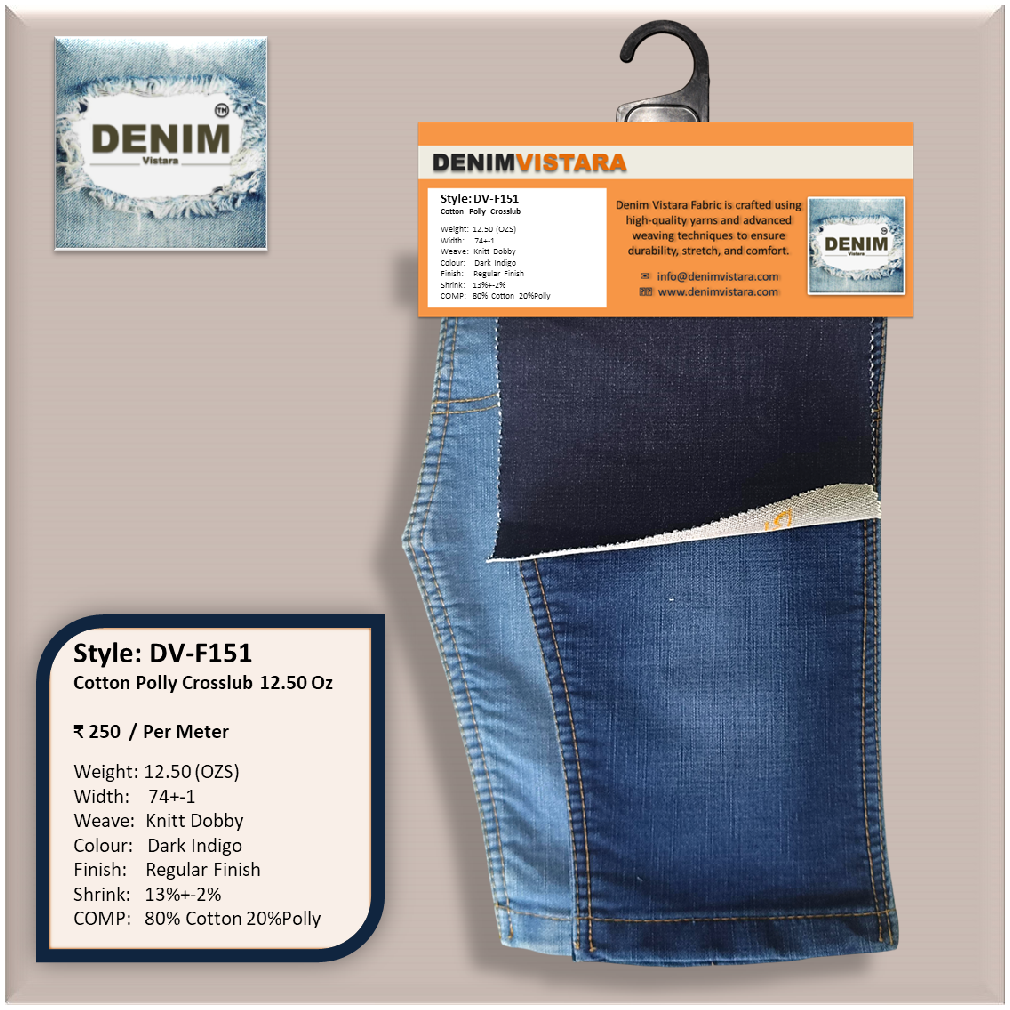 Denim Vistara presents its high-performance 13 OZ Poly Knitted Denim Fabric, designed for comfort, durability, and versatile use. Crafted with a perfect blend of 55% cotton and 45% polyester, this fabric combines the softness of cotton with the strength and stretch of polyester.